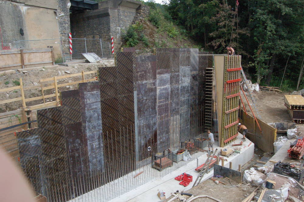 Wir sehen die Fortschritte der Eisenbahnbrücke. Das rechte Widerlager ist ausgeschalt.