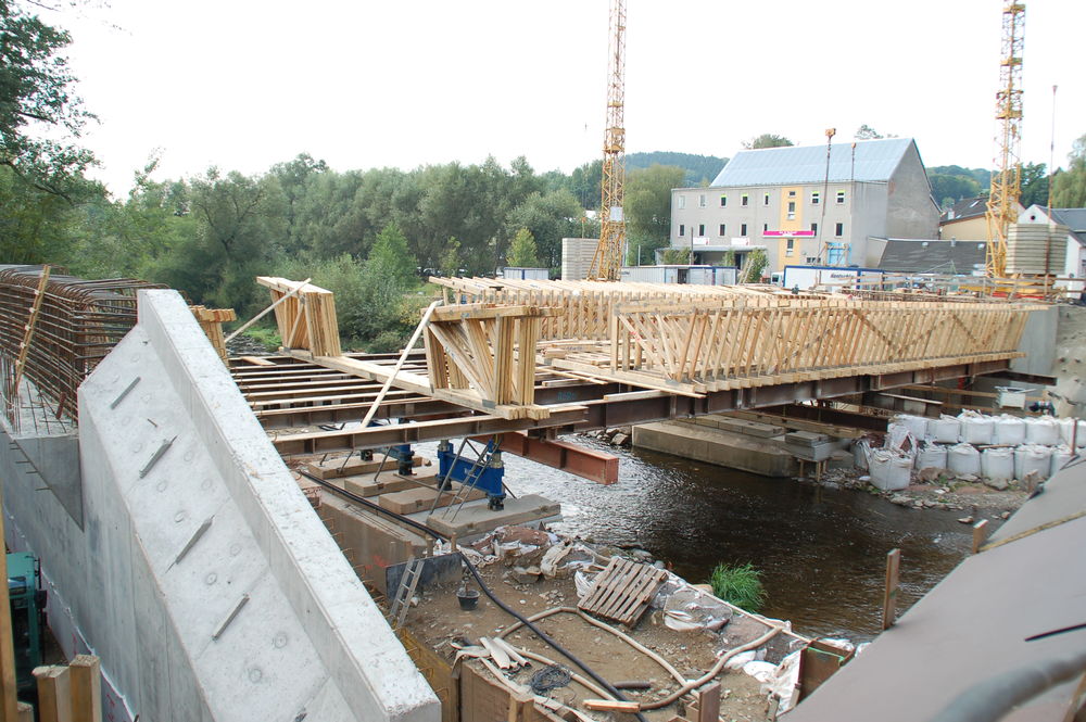 Hier noch eine Sicht von Leubsdorf aus. Links ist das Haus der Familie Martin zu sehen. Im Hintergrund wird die neue Eisenbahnbücke neben der alten Brücke aufgebaut. Diese soll dann im Oktober hydraulisch in die Lücke des Bahndammes geschoben werden.